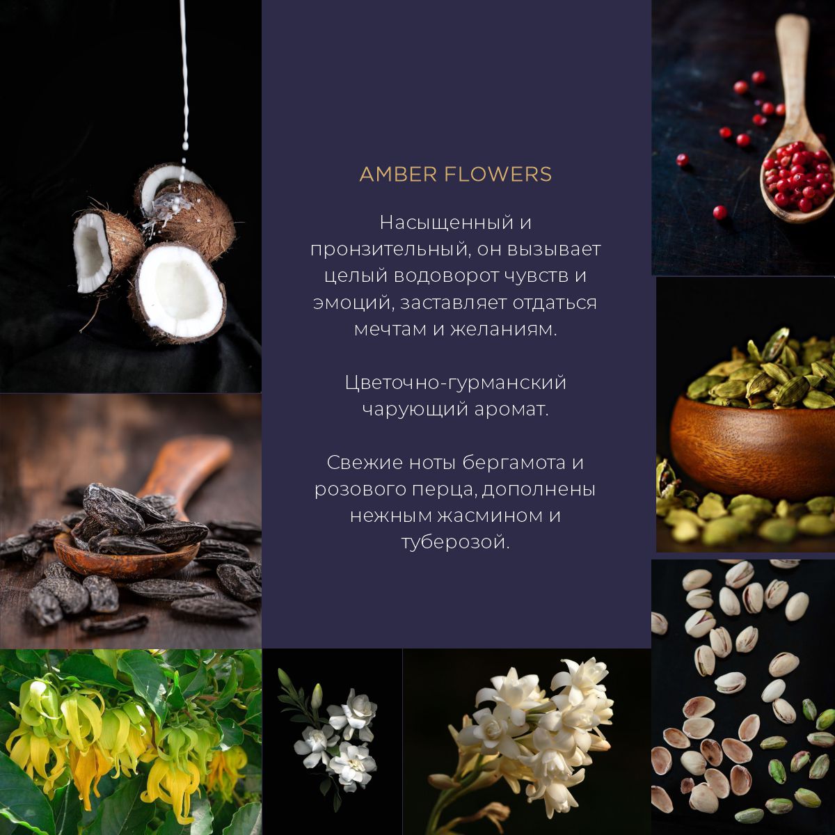 «Amber Flowers» (Янтарные цветы) Аромат - Насыщенный и пронзительный, он вызывает целый водоворот чувств и эмоций, заставляет отдаться мечтам и желаниям. Цветочно-гурманский чарующий аромат. Свежие ноты бергамота и розового перца, дополнены нежным жасмином и туберозой