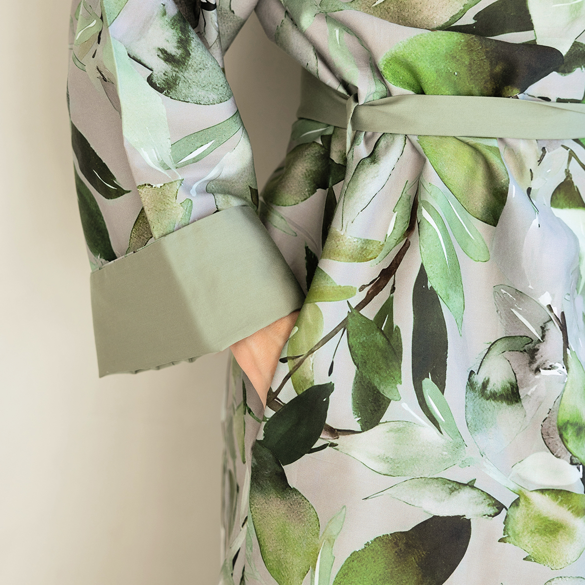 - Удобная модель кимоно с поясом и внутренними завязками позволяет чувствовать себя максимально комфортно. А практичные карманы в швах добавляют удобства в каждодневной носке.