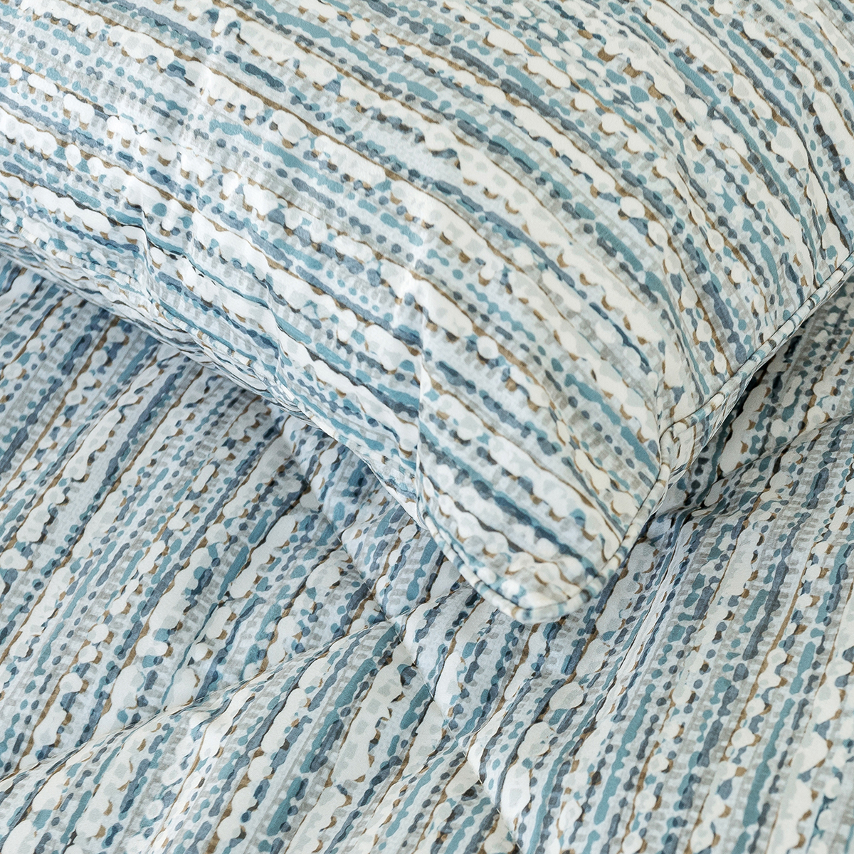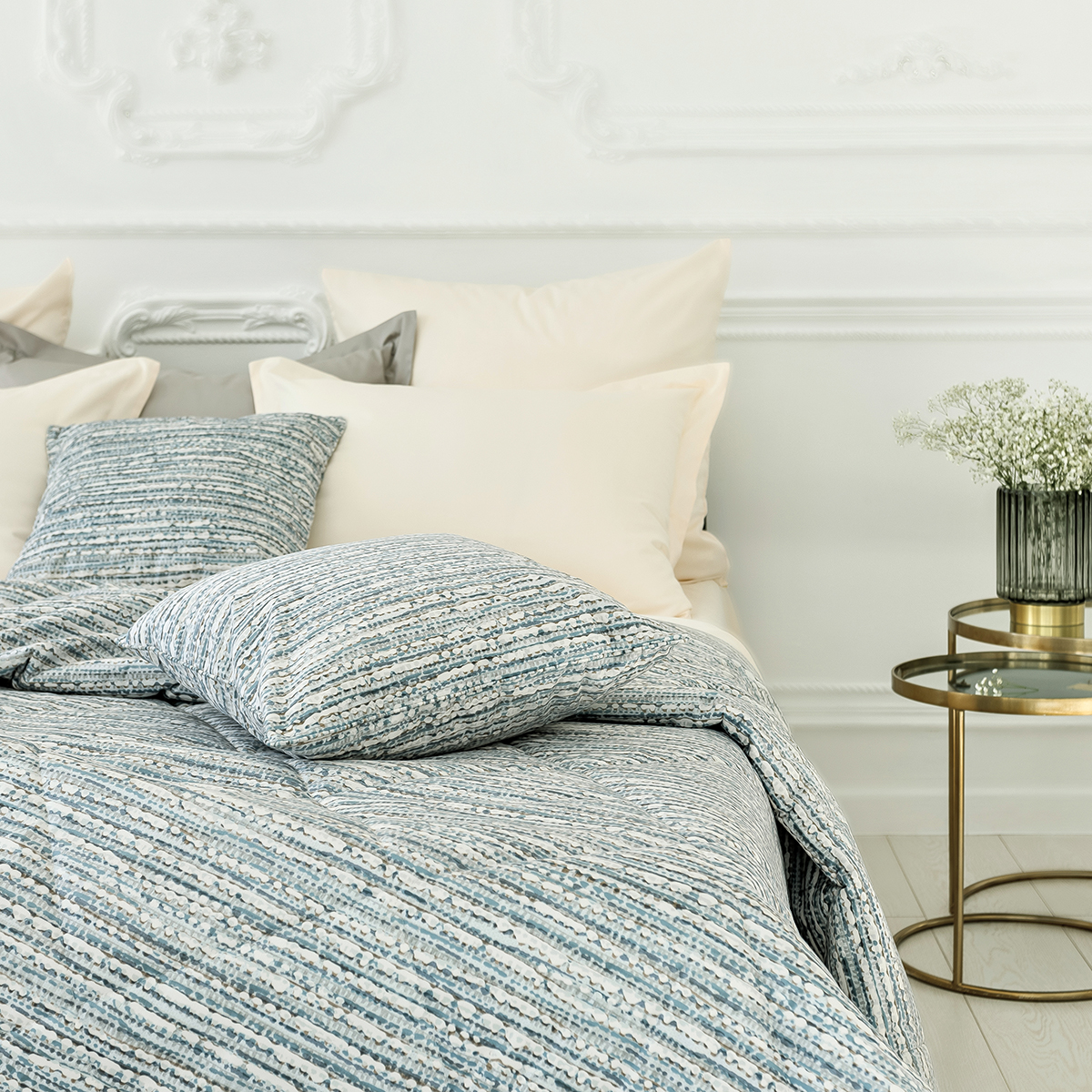 «Данте» - изысканный текстурный узор напоминает спокойное море, чьи волны мягко перекатываются под легким ветром. Тонкие, плавные линии в сине-белой гамме создают ощущение глубины и умиротворения, идеально подходя для современного интерьера. Сдержанная палитра и минималистичный дизайн добавляют спальне уют и элегантность, не перегружая пространство.