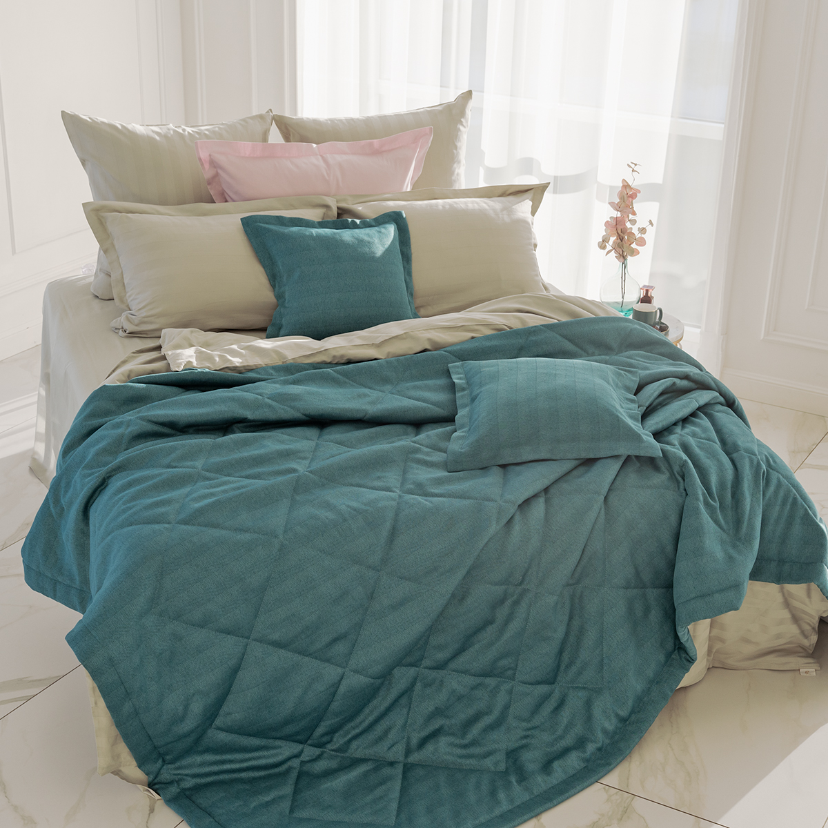 За покрывалом очень легко ухаживать, его можно стирать в домашних условиях при температуре 30С. Покрывало на кровать отлично держит форму и не дает усадку.