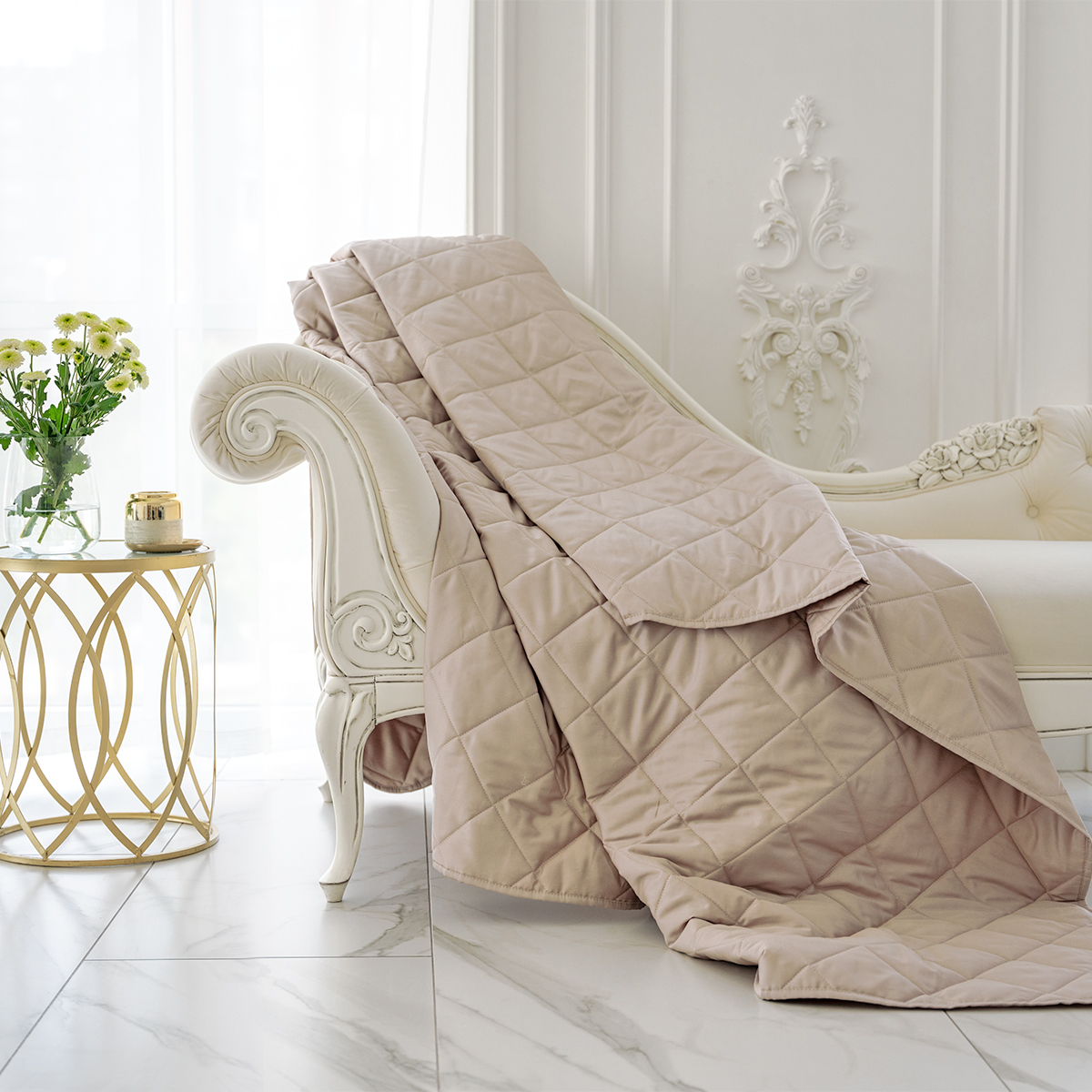 Стеганое покрывало многофункционально: его можно использовать как покрывало для декорирования кровати, так и как легкое одеяло. Покрывало простегано тонким слоем гипоаллергенного наполнителя.