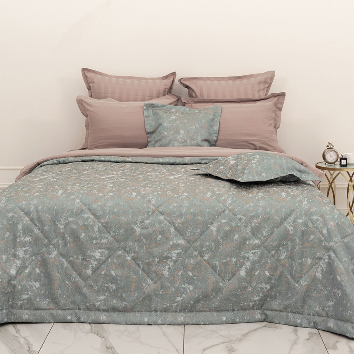 Состав: ткань портьерная жаккард 100% пэ, наполнитель - полиэфирное волокно. Стежка в виде ромбов. Подклад покрывала – микрофибра велюр, за счет своей фактуры он предотвращает скольжение покрывала на кровати.