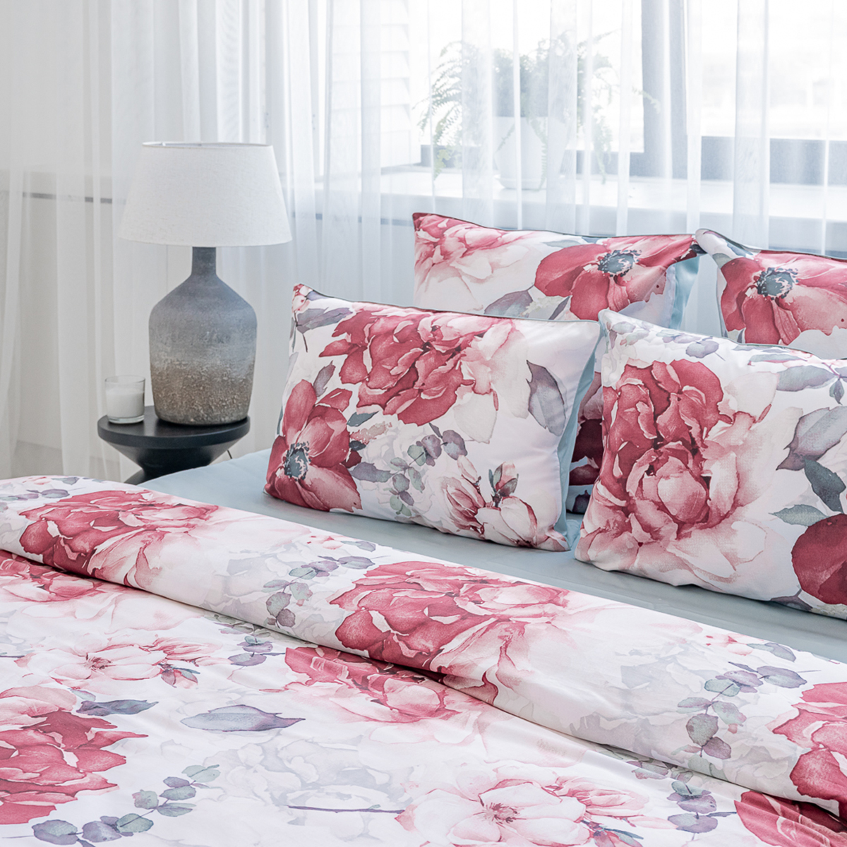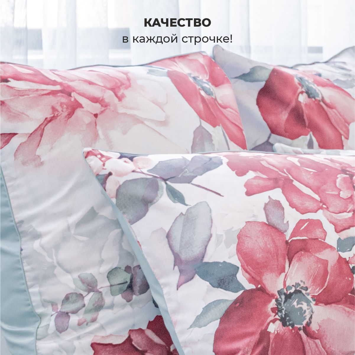 Эффектный акварельный принт, созданных искусным художником. Яркая и сочная красота крупных бутонов чарует и манит… Изящество и нежную красоту роскошного дизайна подчеркивает нежный белоснежный фон комплекта.