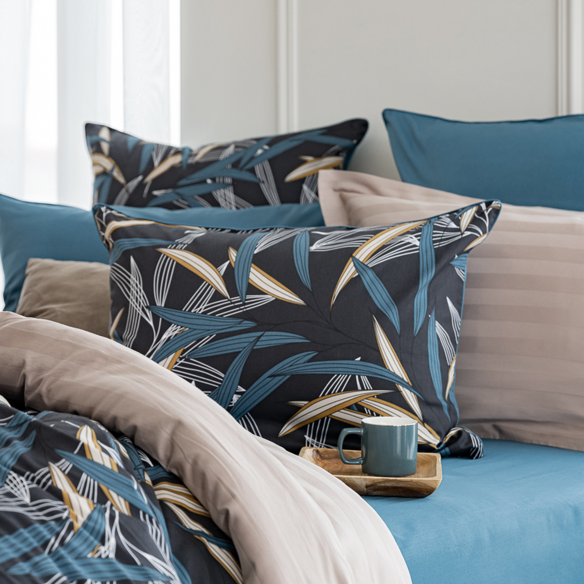 - Наволочки двухсторонние: лицевая сторона– растительный принт, оборотная – однотонная. Декоративный кант по трем сторонам наволочки.