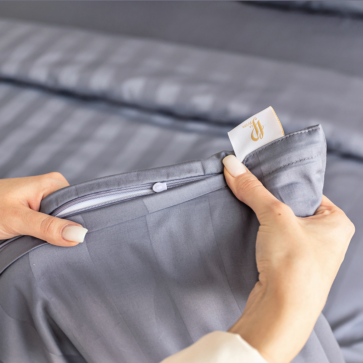 • «Невидимая» молния во всю ширину по нижнему краю пододеяльника. Для быстрой и удобной смены постельного белья в верхней части пододеяльника расположены клапаны для рук. Сменить пододеяльник можно за 30 секунд.