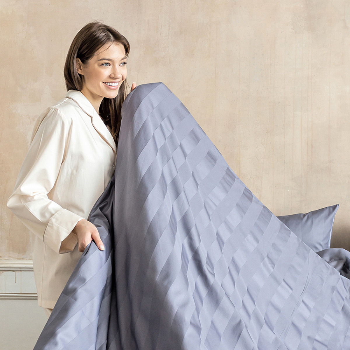 Однотонный комплект постельного белья - роскошный 100% египетский хлопок высшего сорта, с жаккардовым рисунком в виде полос 5х5см. Используется более тонкая 60-я нить. За счет специальной скрутки нити, ткань получается очень мягкая и приятная на ощупь. Имеет благородный блеск.