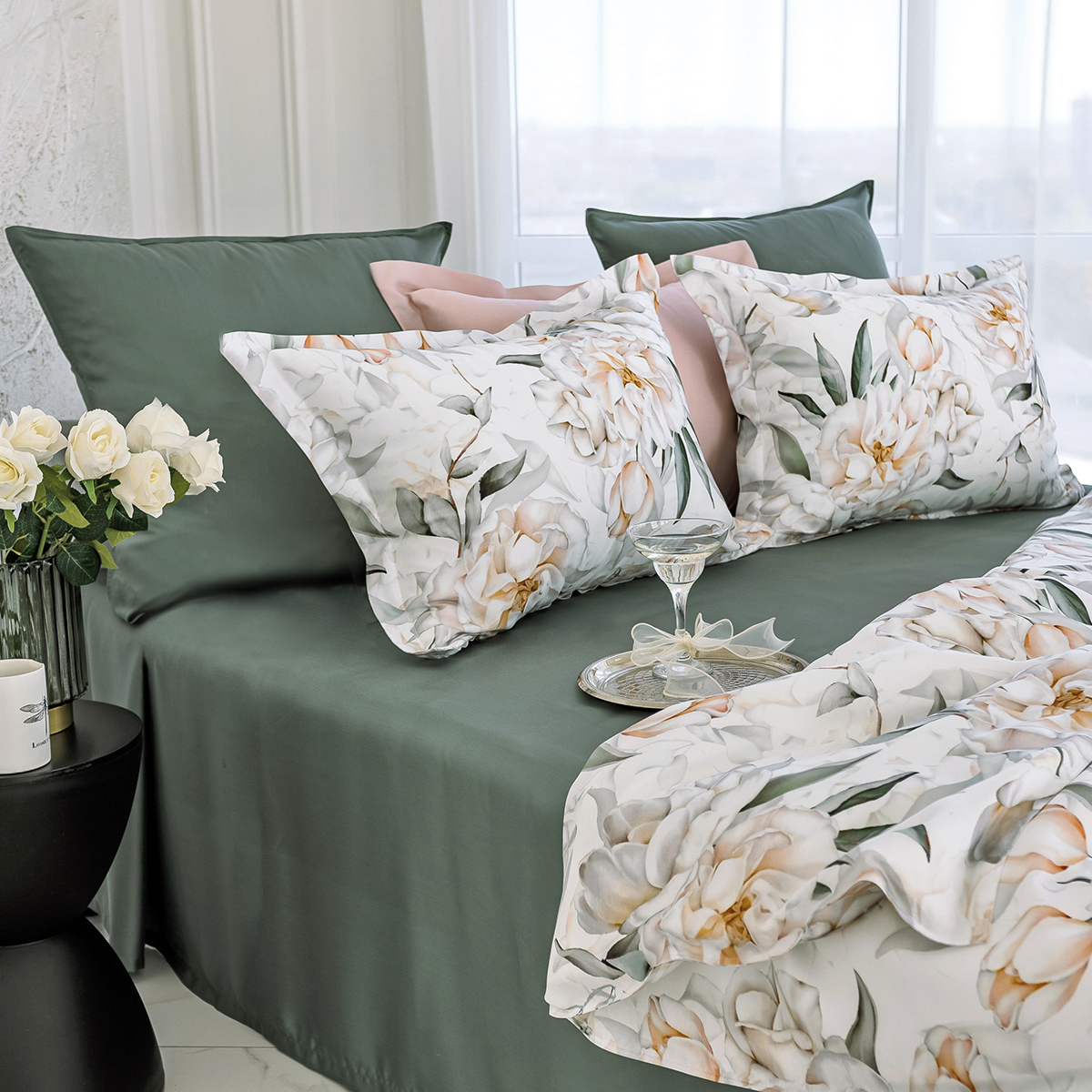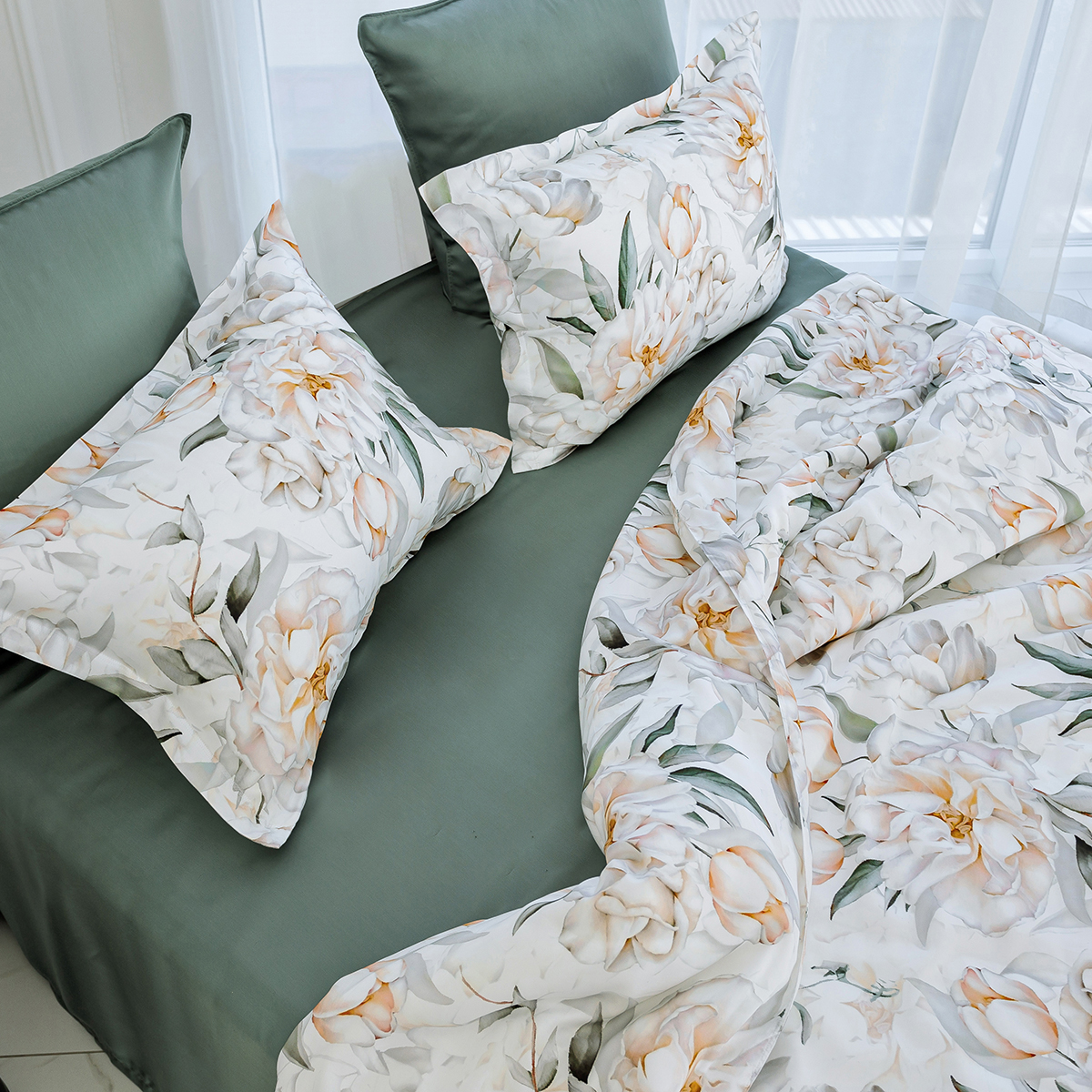 Мягкие переливы цвета пионов откроют в вашей спальне идеальные условия для комфортного сна и отдыха. Этот элегантный комплект сочетает в себе утонченность белого и естественность зелёного, наполняя пространство уютом и легкостью.