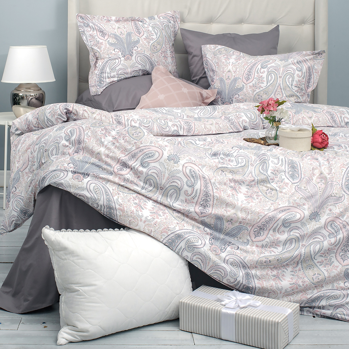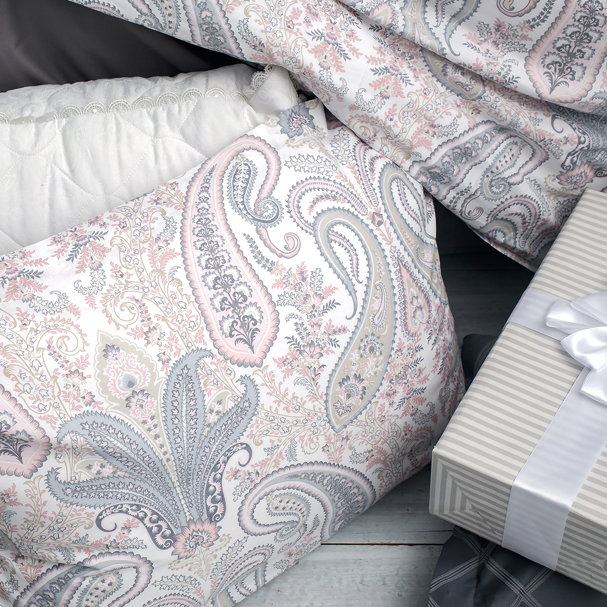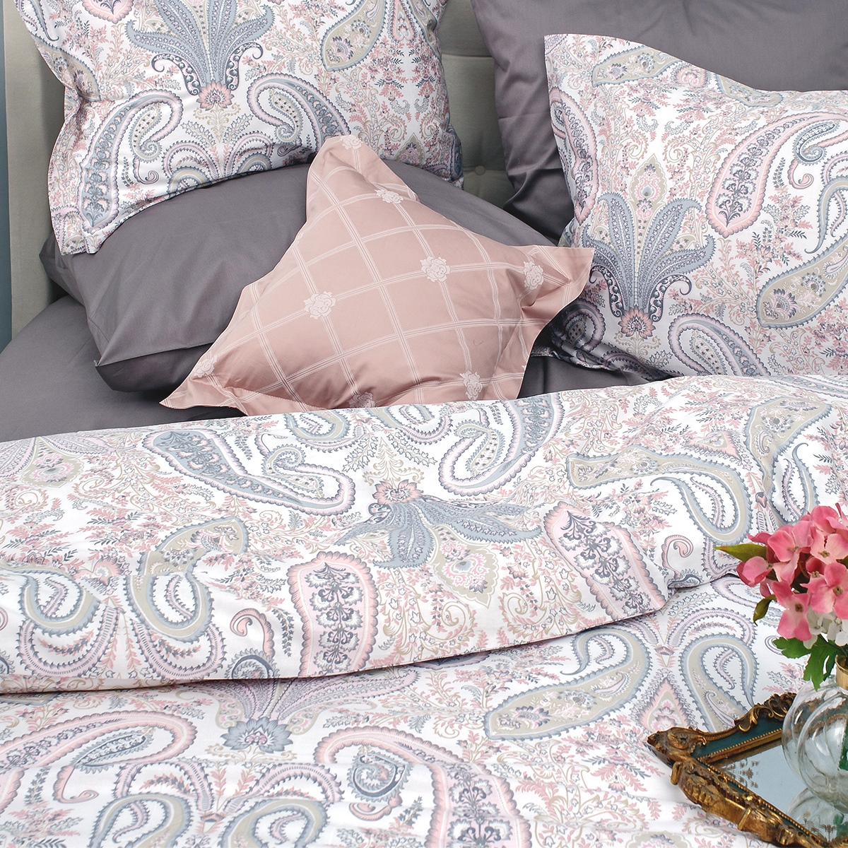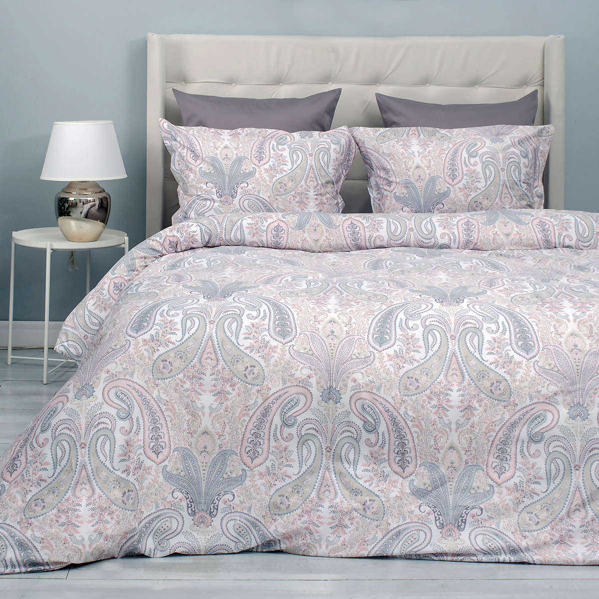 Завораживающий и манящий, не теряющий своей актуальности чарующий рисунок пэйсли. Подчеркивается нежной, воздушной жемчужно-серебристой гаммой с деликатным оттенком цвета английской розы.