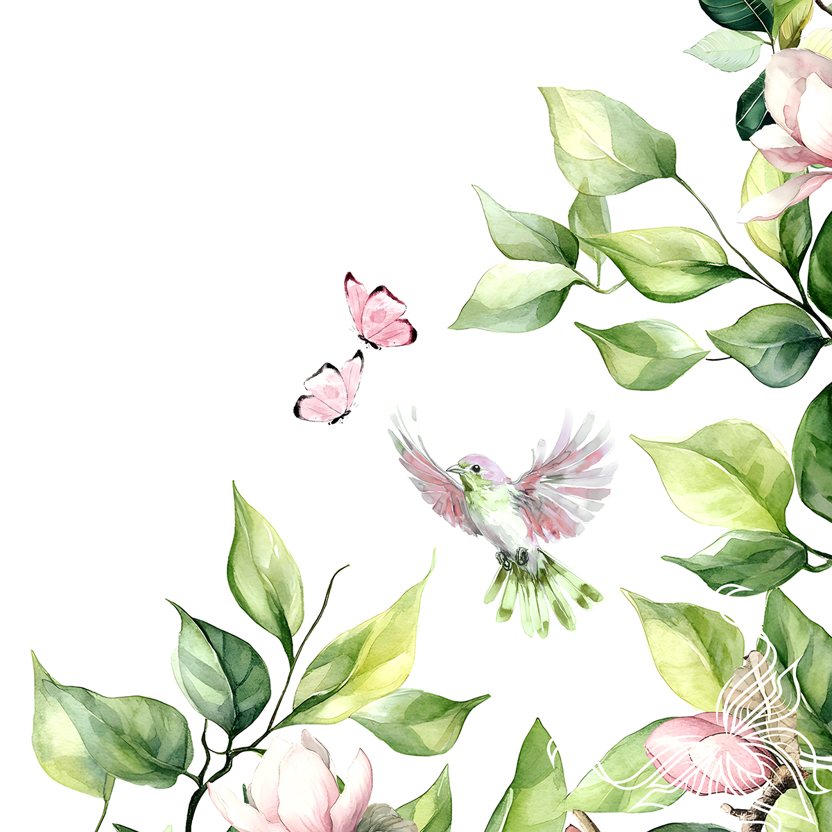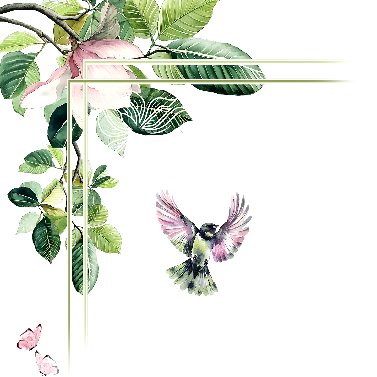 Как живописное полотно в зелёной раме: сочные листья обрамляют спальное место, будто музейный багет. А райские птички и бабочки – будто ожившие персонажи картины, которые решили поселиться в вашей личной галерее сна вот-вот вспорхнут с подушки.