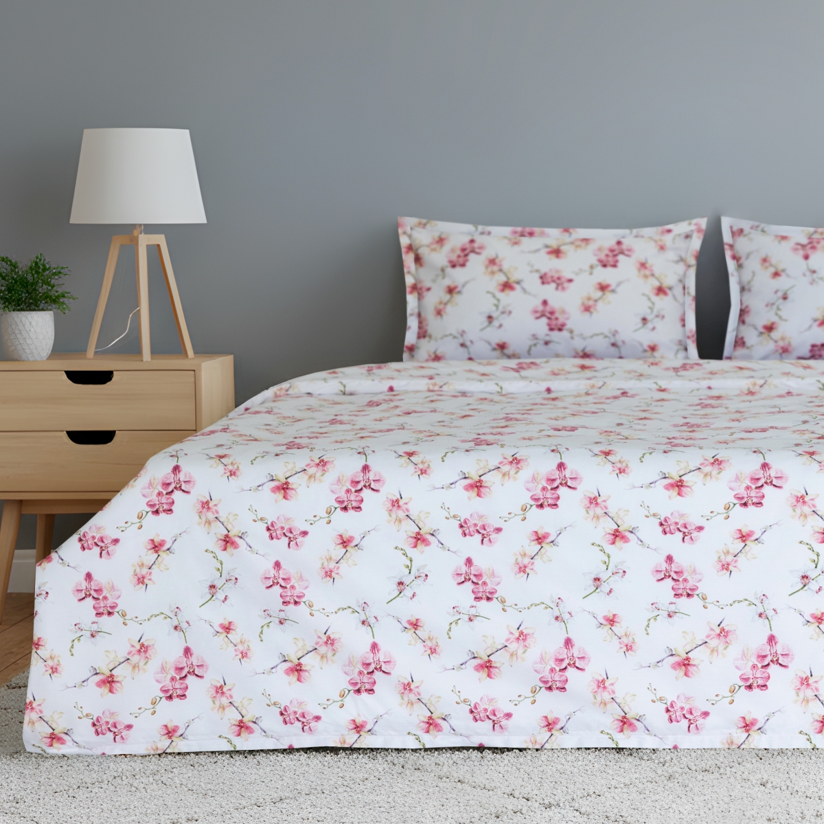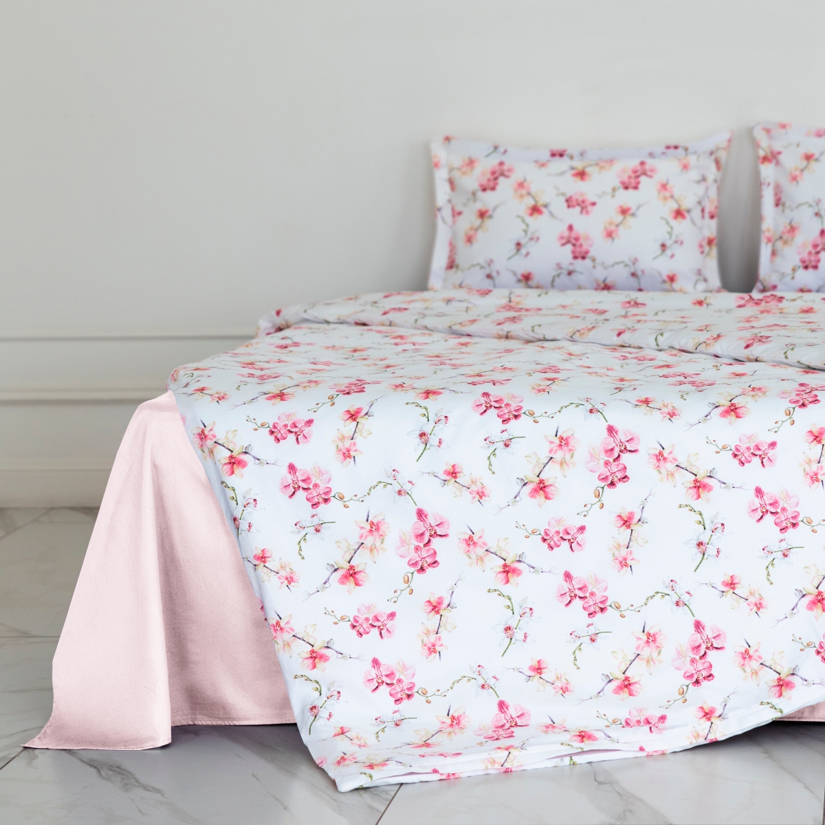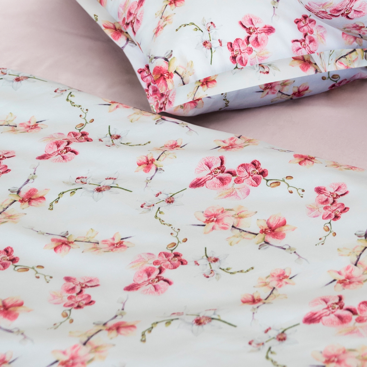 Дизайн «Этюд» - представьте утро, когда за окном — осенняя дымка, а в вашей спальне — по-летнему светло. Идеально белый фон комплекта, как первый искристый иней, отражает свет и наполняет комнату ощущением чистоты и простора. А утонченные орхидеи, застывшие в шелковистой глади сатина, — это напоминание о вашей собственной изысканности и внутренней силе.